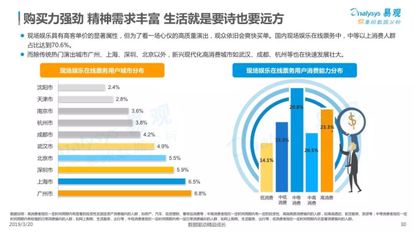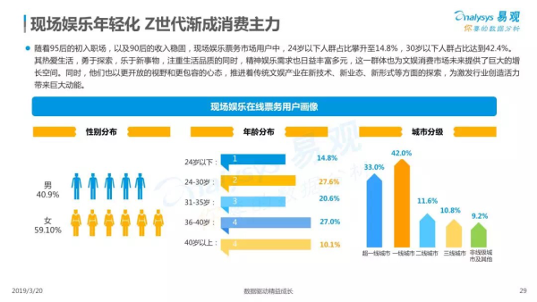 易观报告认为,目前中国现场娱乐票务市场虽然存在整体规模较小、创新创意能力不足、消费产品及服务有效供给不足、产业布局及政策环境仍待完善等诸多问题,但随着文娱消费城市下沉、产业多元延伸等趋势的加强,整个行业仍具有较大的发展潜力。