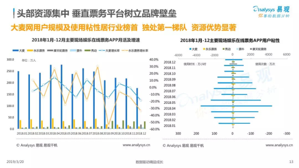 2019年3月20日,国内第三方数据公司易观发布《2018中国现场娱乐票务市场年度综合分析》(以下简称“报告”)。报告显示,2018年,大麦网独处第一梯队,其用户规模、使用粘性、行业独占率及行业渗透率均居行业榜首,生态优势显著。