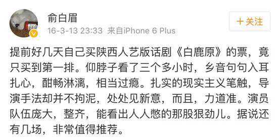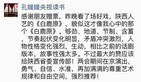 “不朽的小说是把一个民族的悲喜剧在读者心里舞台化,不朽的剧目是把观众心里的舞台缩小到眼前,推荐陕人艺这一版,一晚看遍望不尽的白鹿原。”——著名主持人马东