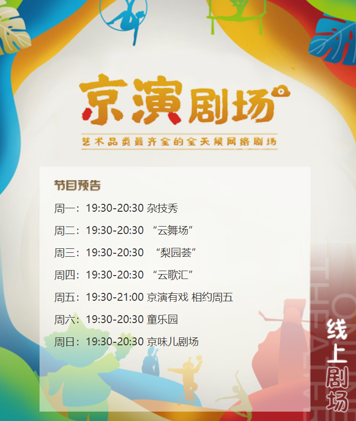 “京演剧场”旨在打造艺术品类丰富的全天候网络剧场,丰富网上文化供给,为广大观众提供更多更好、更便捷的文化产品和服务。每天的演出内容不同,可以根据喜欢的内容准点收看,错过的话还可以看精彩回放哦!