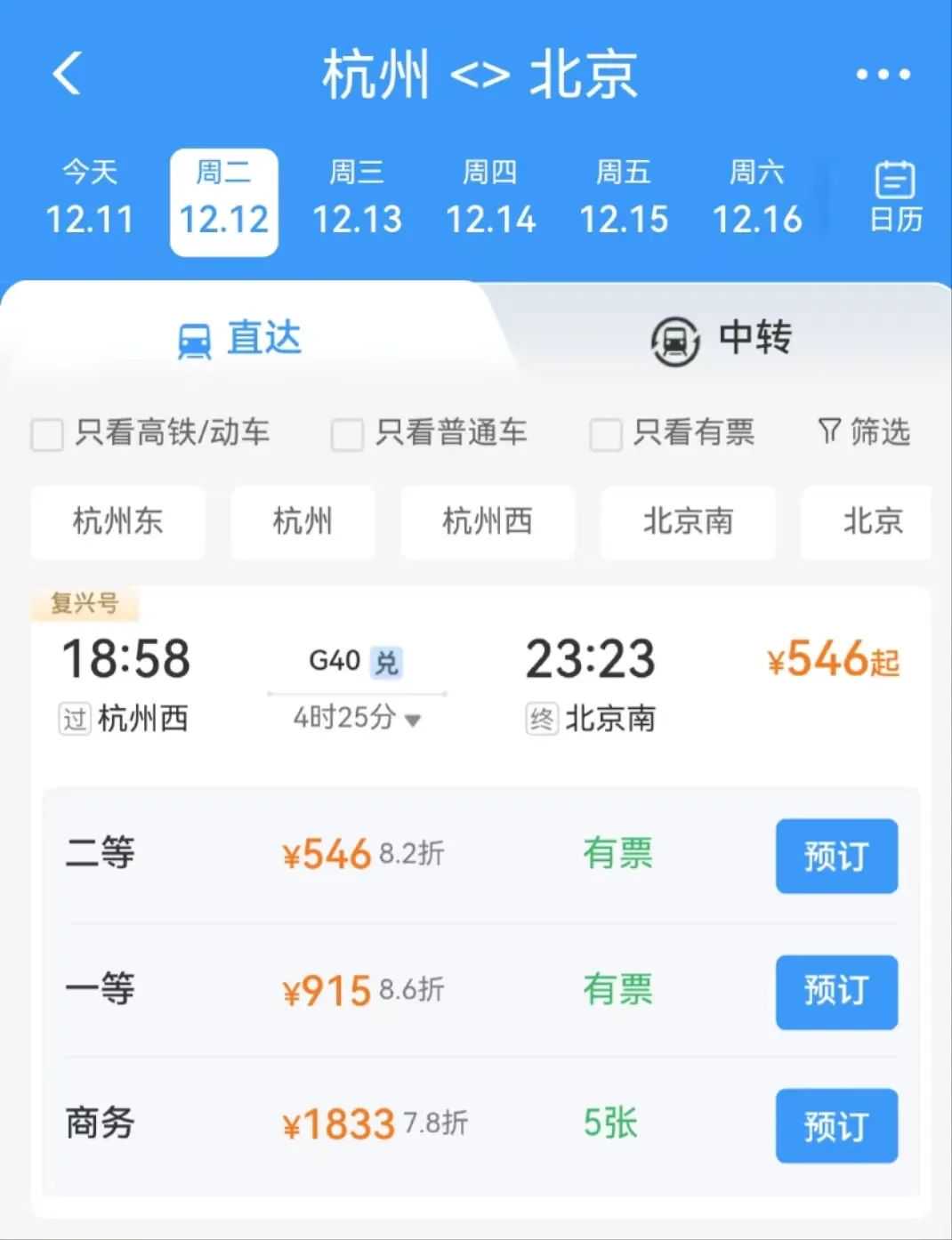 以12月12日杭州至北京的