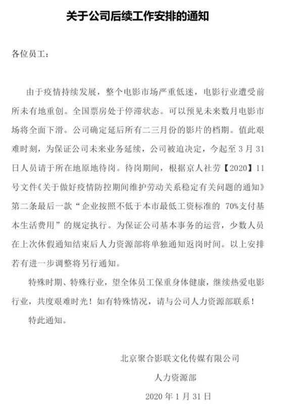 今日流传出一份影联传媒的《通知》显示,由于疫情持续发展,整个电影市场严重低迷,电影行业遭受前所未有地重创。影联传媒决定今日起至3月31日人员请于所在地原地待岗。待岗期间,公司将会按照不低于北京市最低工资标准的70%支付基本生活费用。