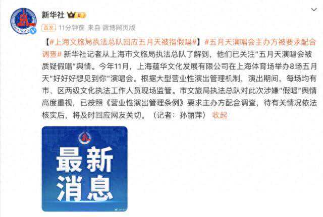 今年11月,上海蕴华文化发展有限公司在上海体育场举办8场五月天“好好好想见到你”演唱会。根据大型营业性演出管理机制,演出期间,每场均有市、区两级文化执法工作人员现场监管。市文旅局执法总队对此次涉嫌“假唱”舆情高度重视,已按照《营业性演出管理条例》要求主办方配合调查,待有关情况依法核实后,将及时回应网友关切。