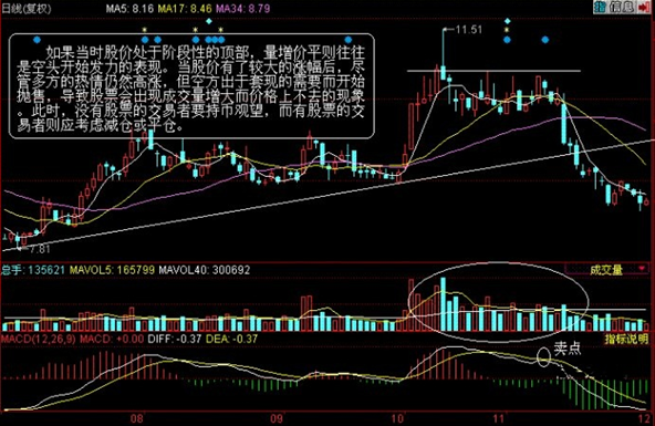 3、股价上涨已多而出现放量却不涨的现象时,代表卖压已经转重,行情可能出现盘跌。