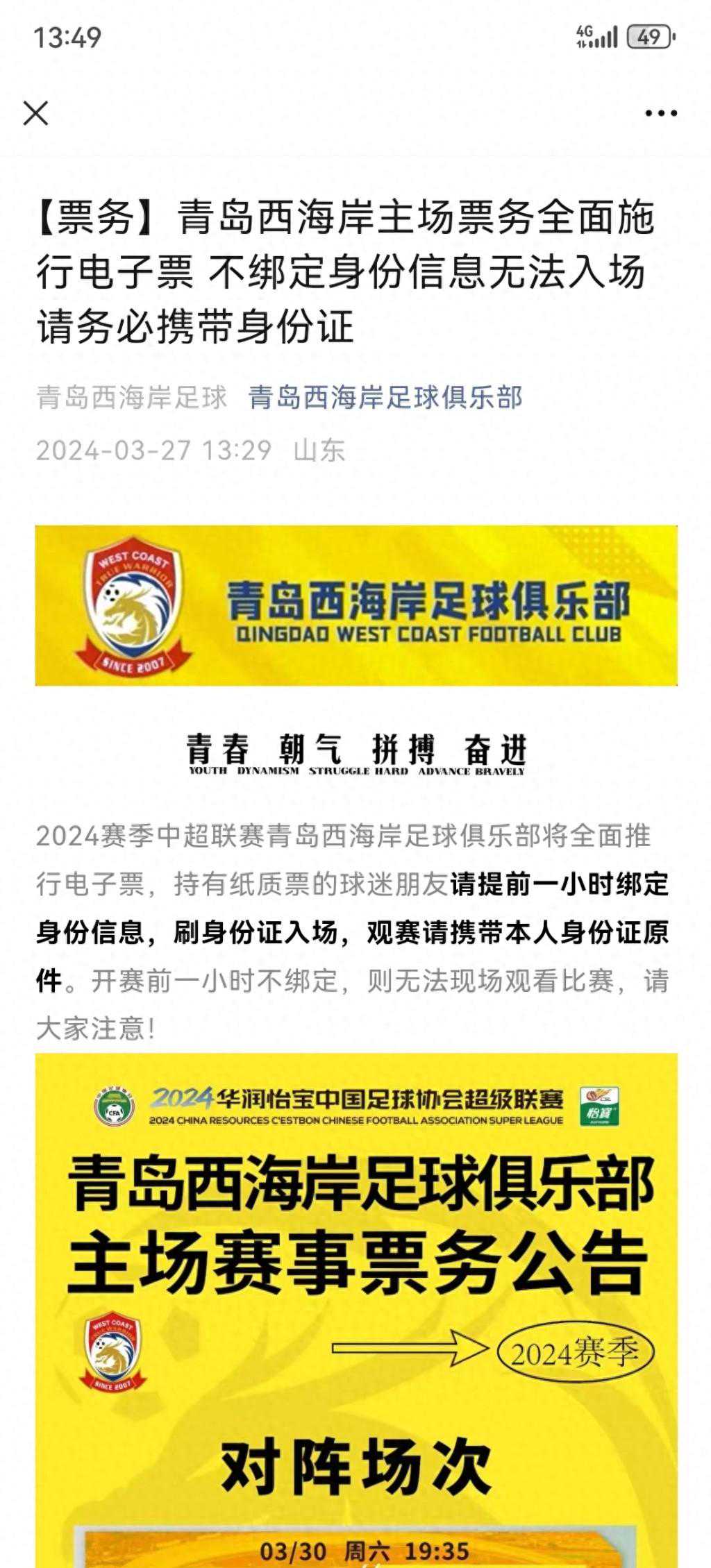 西海岸足球俱乐部在官方公号中写道:2024赛季中超联赛青岛西海岸足球俱乐部将全面推行电子票,持有纸质票的球迷朋友请提前一小时绑定身份信息,刷身份证入场,观赛请携带本人身份证原件。开赛前一小时不绑定,则无法现场观看比赛,请大家注意!