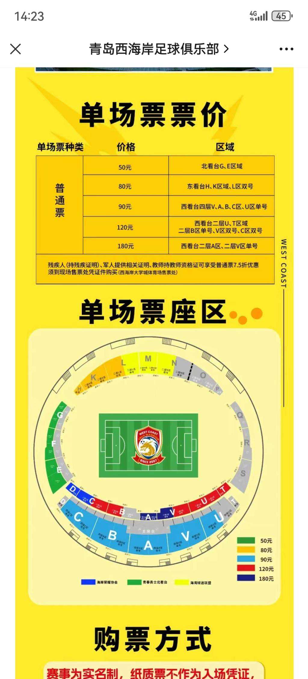 在确定主场实行电子票进场办法后,西海岸足球俱乐部还公布了主场单场票价。普通票最低票价50元,最高180元,中间还有80元、90元和120元三个价位。这个票价在整个中超比赛中是非常亲民的价格。记者购票时发现,目前除了50元的票已经售罄外,其他价格均有余票。