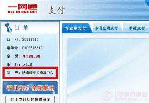 您可以选择以上几种自己开通的网上银行前往付款,比如小编由于开通的是招商银行的网上银行,因此选择“招商银行”之后即可进入支付页面,在支付页面上我们看到商户名称是“铁道部资金清算中心”右侧需要填写上您的招商银行的银行卡号以及密码等,如下图: