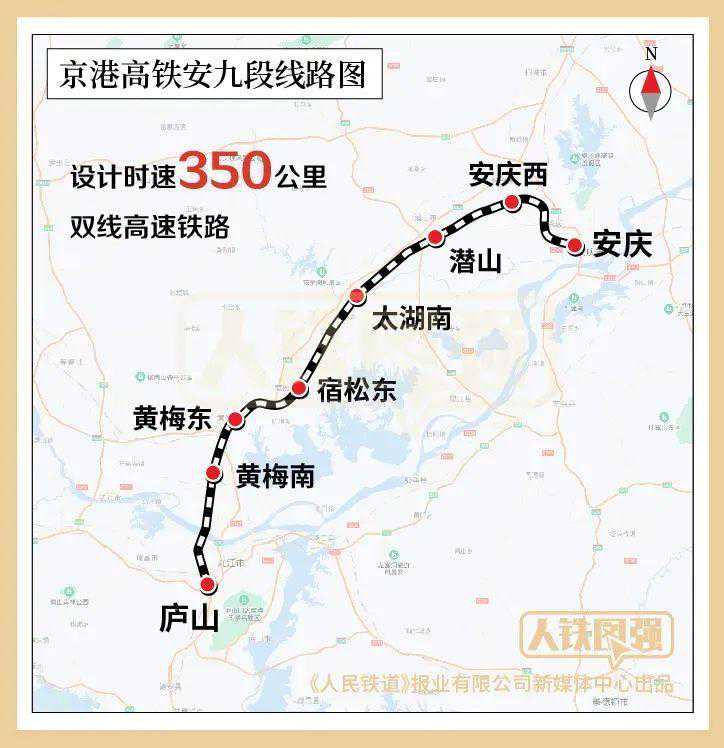 京港高铁安九段自安庆西站引出,经安徽省安庆市怀宁县、潜山市、太湖县、宿松县,湖北省黄冈市黄梅县,终至江西省九江市庐山站,线路全长176公里,设计时速350公里。全线共设安庆西、潜山、太湖南、宿松东、黄梅东、黄梅南、庐山7座车站,其中庐山站为既有车站。