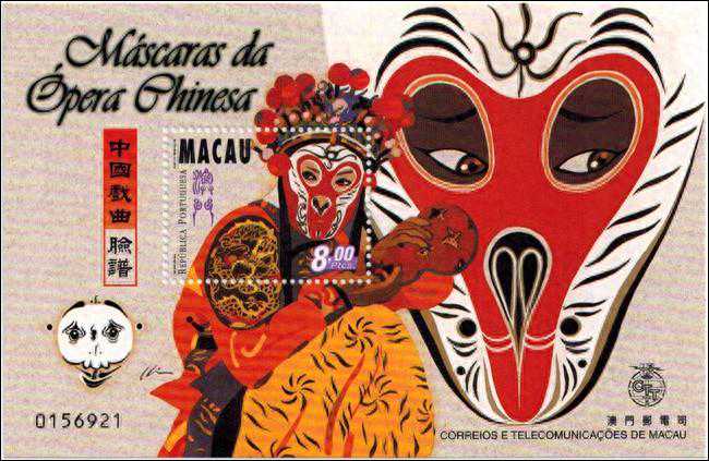 这是澳门回归前,由澳门邮政于1998年7月28日发行的《中国戏曲-脸谱》小型张,由吴卫坚设计。