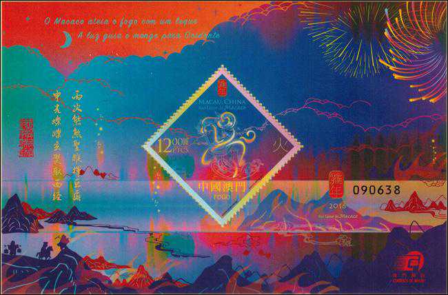 澳门2016年1月22日发行的猴年生肖邮票小型张,左下角有师徒4人过火焰山的图案。