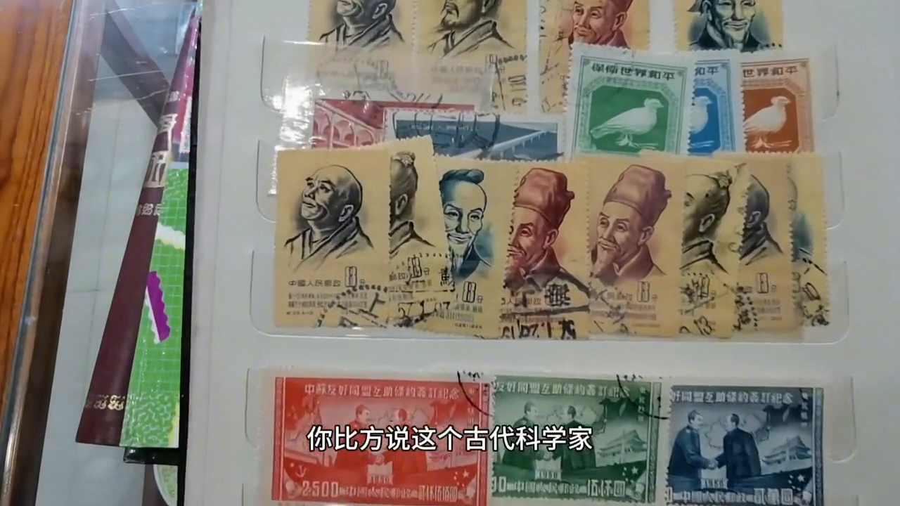 比方说新的值1000块,但是它的旧票就值10块钱,就值100块,就是能差差距能差这么大(有的差2倍)。还有一个就是有的家里,有的保存上一代人的老信封,邮票从信封上面不要揭下来了。比方说古代科学家,像这个应该是祖冲之,算圆周率的,僧一行里面应该有祖冲之、李时珍(口误),像羊肉粒、像这种票,信销的、普通戳的,就几块钱一张,十块钱了不得了,但是如果在信封上面,就是50打底。