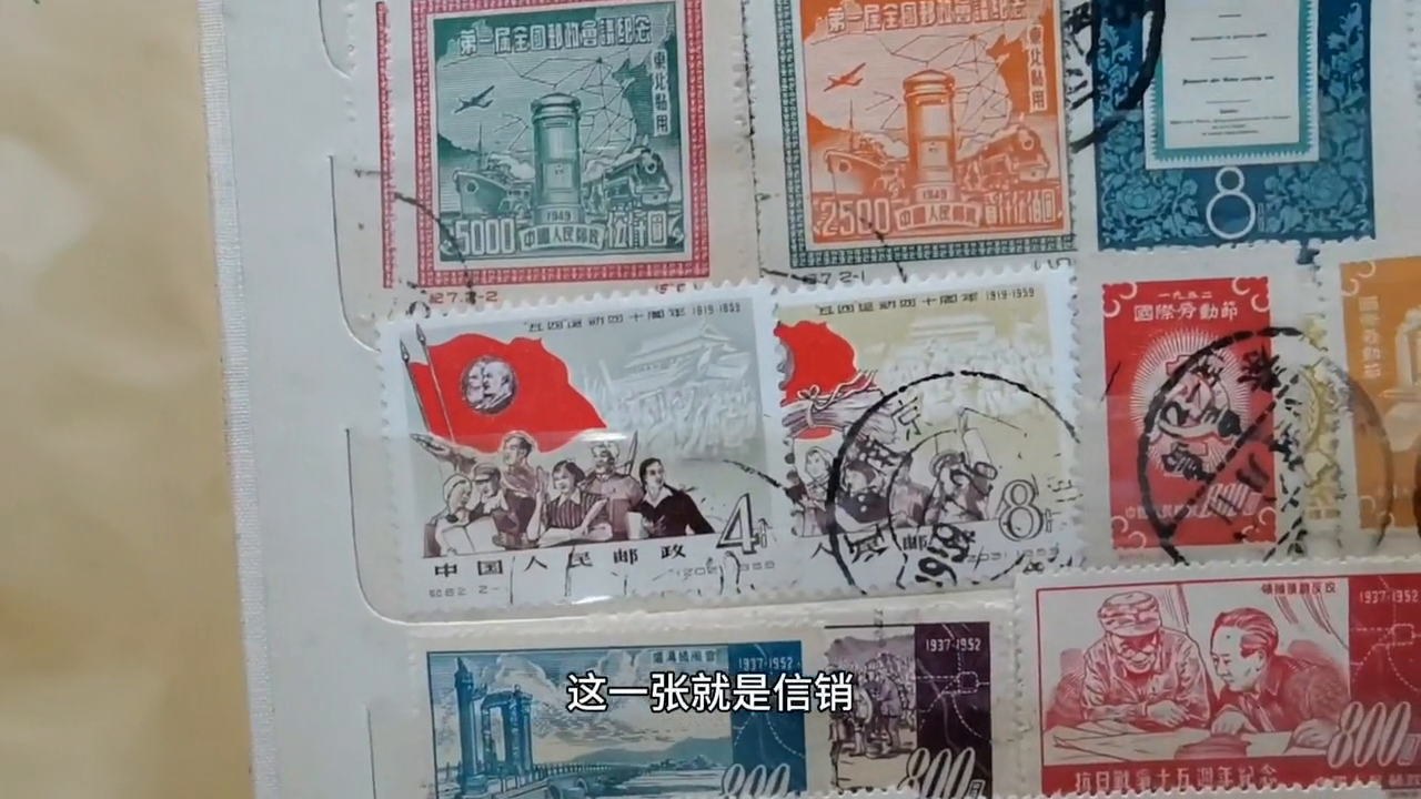 所以这个邮票,像这种邮票叫盖销票,票面也干净,只不过多了一个撮,便宜出售给大家。盖销票从50年代开始,到了90年代还有现在就没有了,因为现在生活条件好了,也不在乎那点钱了。有出的叫信销,信销就是指寄过,你看这一张就是信销,这跟着盖销,一看就看得出来。