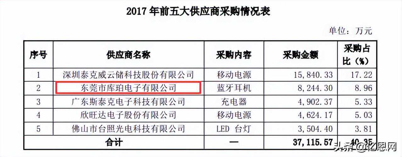 泽宝是深圳知名的跨境电商头部卖家,主要在亚马逊平台上售卖消费电子产品。根据泽宝发布的公开信息,库珀为主要供应商,并连续多年成为其第二大供应商。公司主要向库珀采购的产品为蓝牙耳机。2017年泽宝向前五大供应商采购的产品金额为3.71亿元,占采购总额比例的40.35%,泽宝向库珀电子采购金额达8244.3万元,占总采购比例为8.96%。