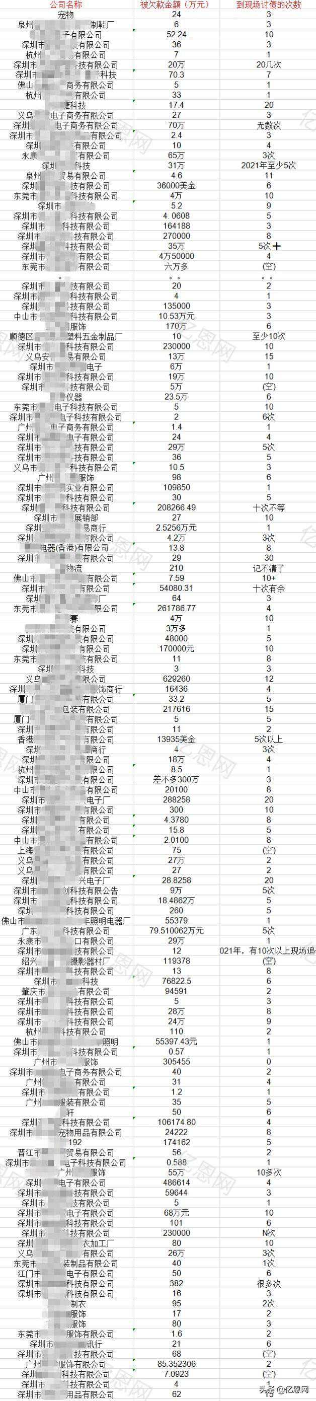 因长期拖欠货款,环球易购曾多次被供应商堵门,其中闹得最大的一次是去年6月。亿恩网曾收集了当时部分讨债供应商的信息,他们遍布深圳、广州、佛山等十几个城市,欠款金额从几万到几百万不等,为了拿回货款,大多数供应商去现场追债的次数不低于5次,甚至有商家前去30多次仍未拿到货款。