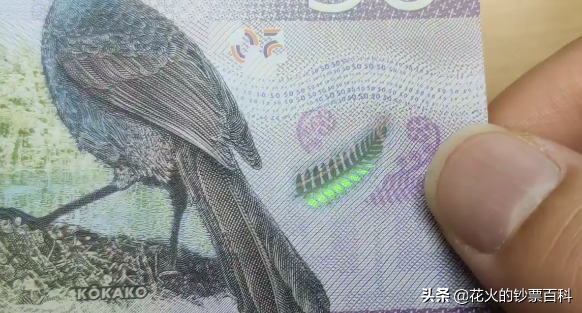 钞票正面左下角的新西兰冠鸦的印刷图案是OVMI光学渐变磁性油墨印制的,把钞票对着光线旋转,黄头雀的身体上会有一道黄色的、贯穿鸟身体的防伪反光带出现,倾斜钞票会转动。由于这个位置有透明的效果,所以背面的银叶蕨图案同样有光变的效果。这是这张钞票的一大亮点。