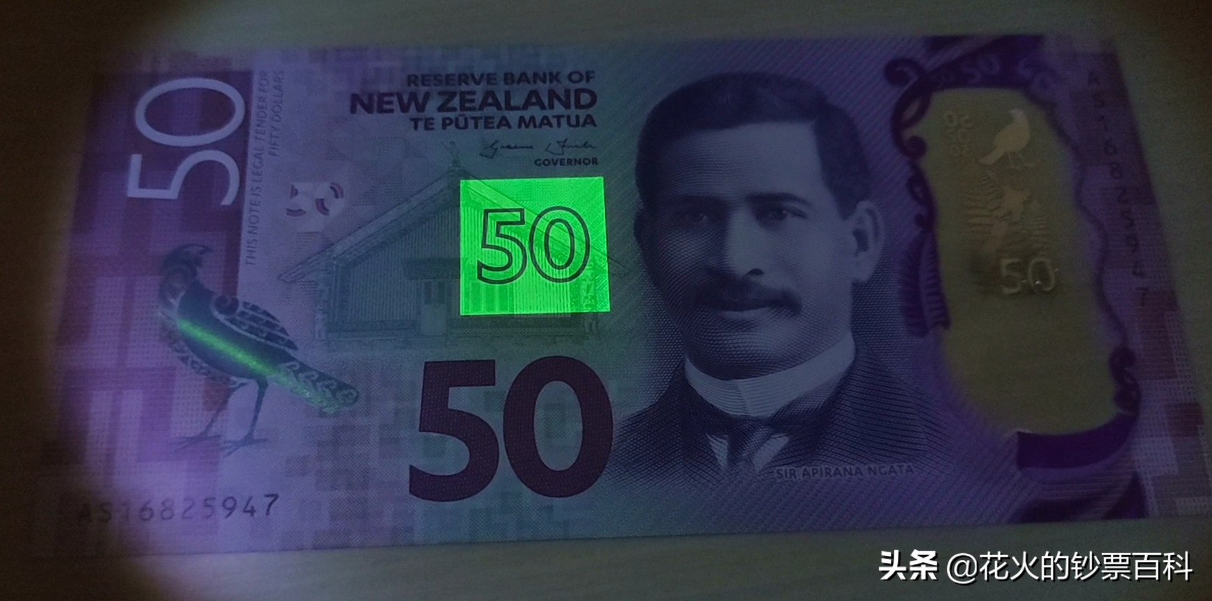 我这张是新版的,在2016年5月发行的。新版本的50元钞票在大小上与旧版本保持一致,但是在颜色上的改变比其它面额的钞票要大一些,目前的老版本50新西兰元纸币颜色偏红和粉,暖色系一些;而新版本50纽币钞票的颜色偏紫,中间发青,更偏冷色系一些。