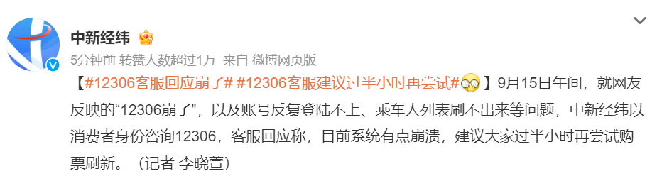 据@中新经纬,9月15日午间,就网友反映的“12306崩了”,以及账号反复登陆不上、乘车人列表刷不出来等问题,中新经纬以消费者身份咨询12306,客服回应称,目前系统有点崩溃,。