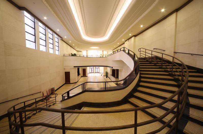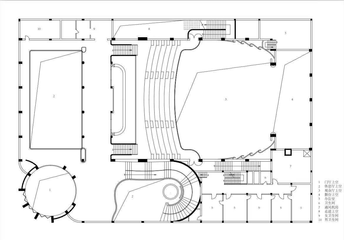 美琪大戏院对这一序列又做了新的发挥,在组织入口门厅、休息厅和观演厅的空间关系时,做了充分利用转角地形和基于功能主义的考虑。观众厅沿地块长向布置,东南侧布置管理办公用房;入口圆形门厅布置于街道转角处,分别向两侧延伸出两个通向观演厅的休息厅,一侧连接首层观演厅,另一侧休息厅通过弧形楼梯可达楼座层的观演厅。在满足各功能空间使用需求的同时,休息厅面积达到最大化——几乎是观演厅面积的三分之二,这在当时上海的影院建筑中较为突出,并成为空间设计的重点。圆形的入口门厅与两个矩形的休息厅均采用两层通高的开敞方式,使整个公共空间连为一体。连接二楼观演厅的弧线楼梯与圆形门厅形成呼应,成为空间中着力刻画的另一处重点,弧线的元素也用在了建筑其它细部的处理之中。建筑地面采用水磨石,十分简洁。为了保证休息厅的布局和面积,影院建筑临街常设置的店铺也被大幅缩减,休息厅的重要性得到进一步强化。这一方面是出于快速疏散观众的功能需求;另一方面,丰富了观影者进入观演厅前的空间体验,强化了看电影的仪式感。