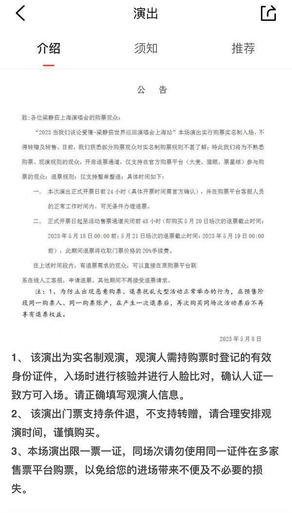 值得注意的是,与普通实名制入场不同,这次在上海梅赛德斯奔驰文化中心举办的梁静茹演唱会采用“强实名制”。记者查询大麦、猫眼等票务平台发现,观演公告中提醒,观众入场时,必须携带与门票绑定的本人身份证件,要经过安检、闸机验证人脸、核验证件信息等几道步骤,全部通过方可进场。另外,不仅不支持退票,还写明不能转赠及转售。同样,为了防止黄牛泛滥,刘若英上海站演唱会也采用了相同的“强实名制”。