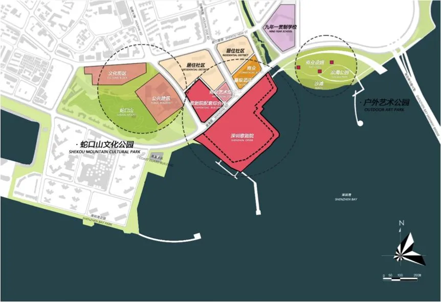 歌剧院地块未来将与周边山体、海岸、公园与城市街区有机融合。地块西侧将植入公共建筑与文化街区,打造蛇口山文化公园;地块北侧将规划星级酒店、商业艺术综合体等,提供完善的城市服务配套;地块东侧的深圳湾滨海休闲带将打造户外艺术公园。