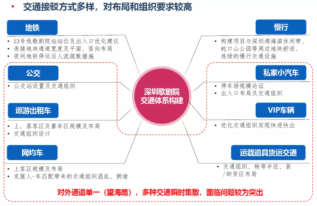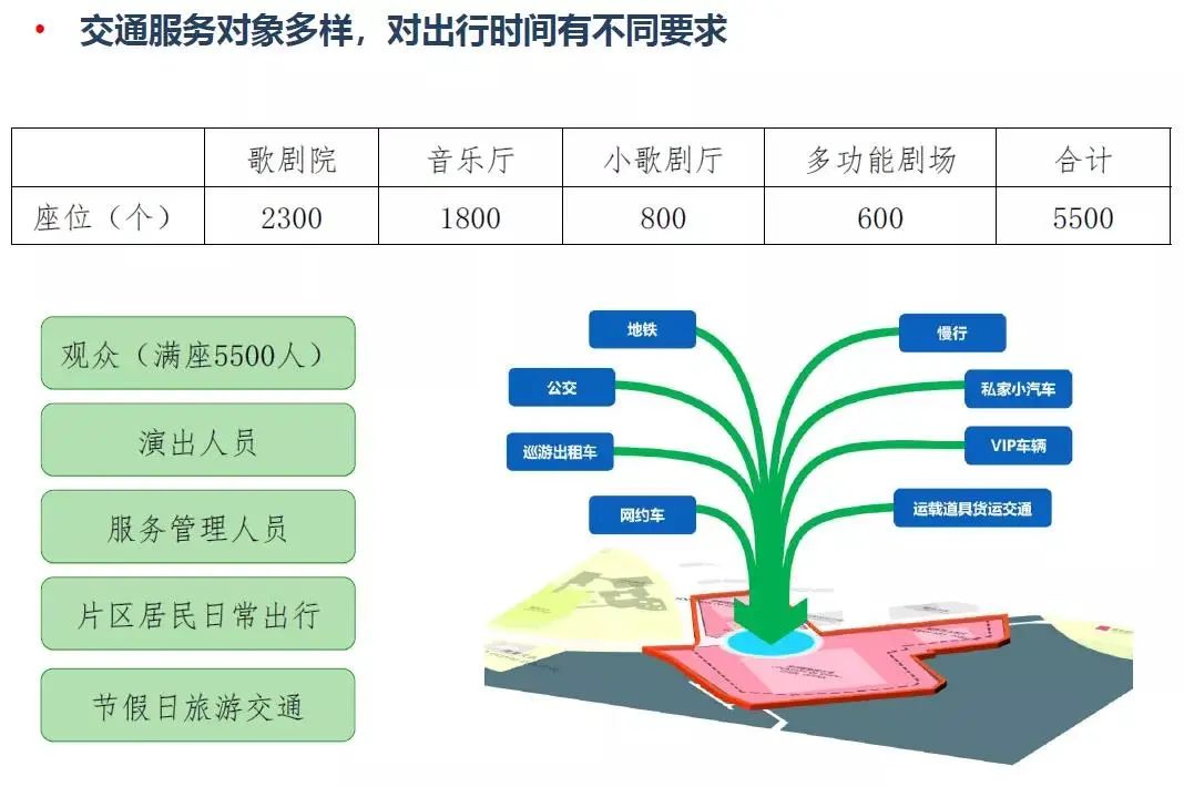 设计要求衔接周边片区交通组织,合理布置不同功能的出入口,有效组织观演人员流线、贵宾流线、演出人员流线、货运流线等多种流线,避免相互交叉干扰,实现场地交通组织的高效性。设计应统筹考虑与望海路地下道路的衔接。要求结合轨道站点实现南北区负一层地下空间的步行连接,构筑地下文化漫游区;衔接片区公共流线系统,打造立体连续、舒适宜人的艺术化慢行游览体验