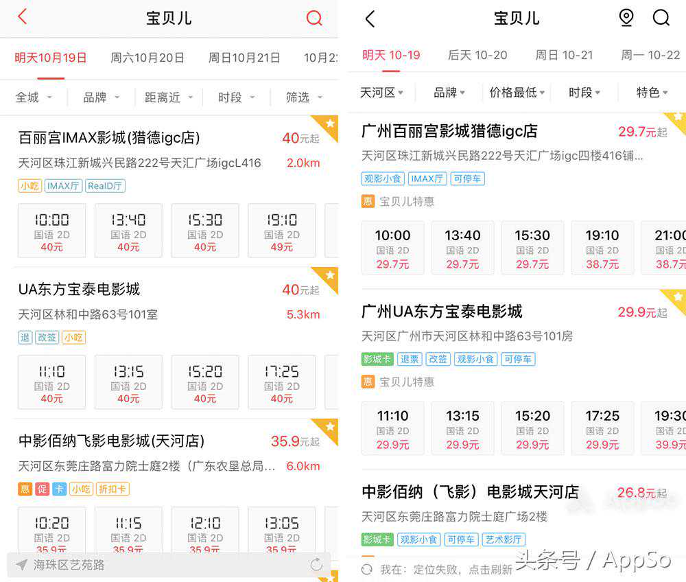 ▲左为猫眼,右为淘票票,《宝贝儿》在两家平台的价格相差较大