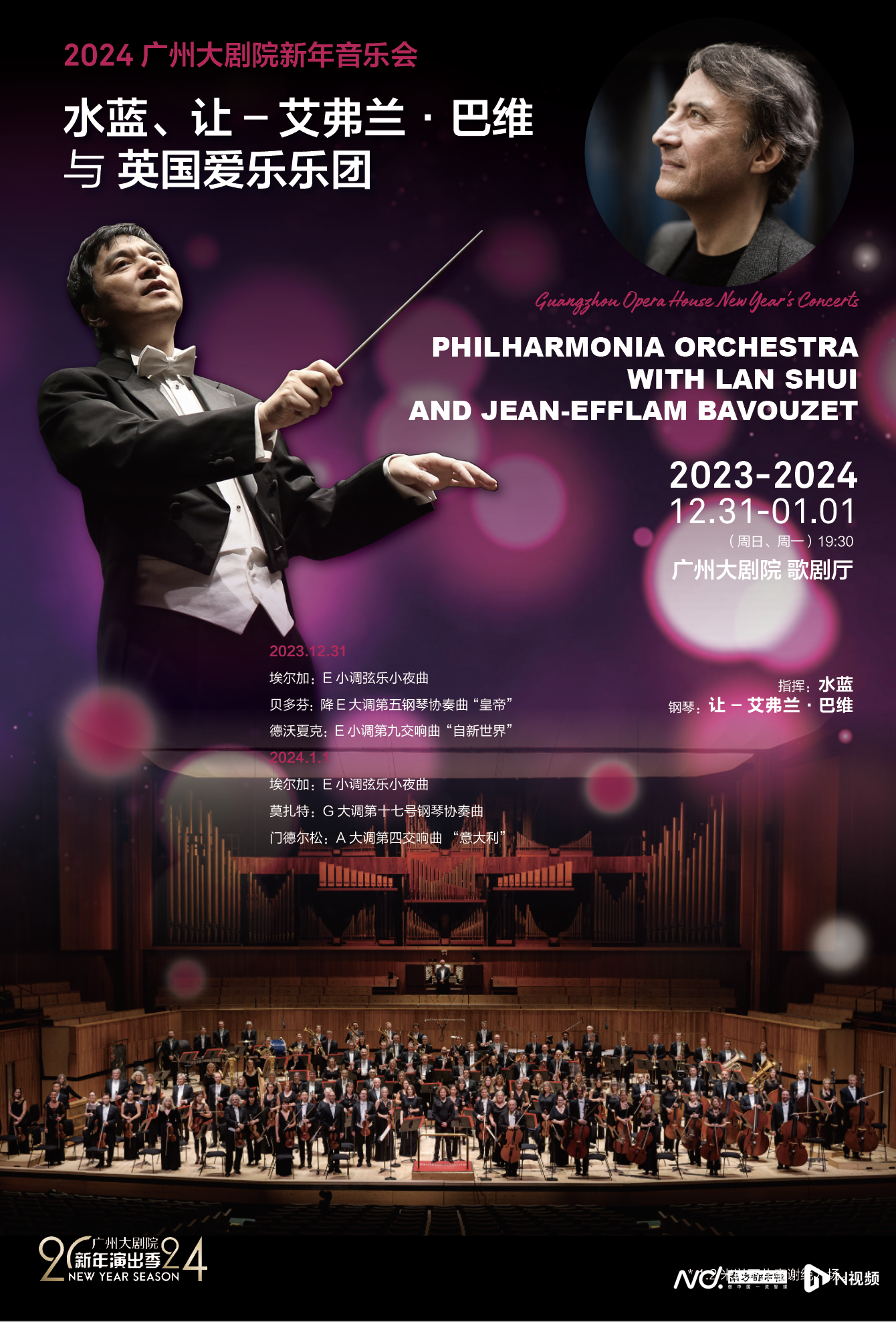 跨年夜将由英国爱乐乐团担纲。著名指挥家水蓝携手法国钢琴大师让-艾弗兰‧巴维,与英国爱乐乐团带来两场兼具柔美抒情与激情澎湃的新年音乐会,在广阔而富有生机的音乐世界中迎接2024新年的到来。起始于浸润着埃尔加对妻子柔情蜜意的《E小调弦乐小夜曲》,两场音乐会将分别带来贝多芬宏伟华丽的“协奏曲之王”《第五钢琴协奏曲“皇帝”》和德沃夏克广为人知的交织着民族情感与“美国风味”的《第九交响曲“自新世界”》,以及堪称莫扎特钢琴协奏曲“桂冠之作”的《第十七号钢琴协奏曲》和门德尔松充满了异国风情的《第四交响曲“意大利”》,演绎从古典主义到浪漫主义的乐彩华章。