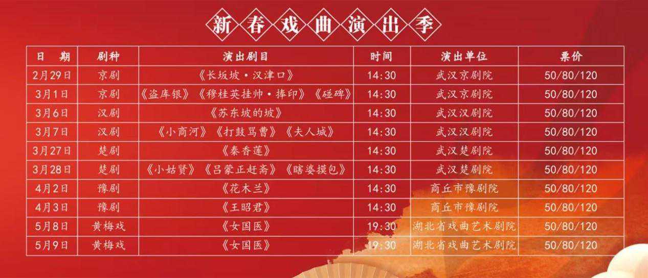 汉调雅韵、楚腔悠长、黄梅飘香……新春戏曲演出季由湖北省演艺集团主办、湖北剧院承办,据了解,本次戏曲演出季多个剧种具有代表性的名家名角将轮番登台献艺,与江城戏迷乐享新春。2月29日至5月9日,将陆续亮相京剧《长坂坡·汉津口》《盗库银》《穆桂英挂帅·捧印》《碰碑》,汉剧《苏东坡的坡》《小商河》《打鼓骂曹》《夫人城·还斗》,楚剧《秦香莲》《小姑贤》《吕蒙正赶斋》《瞎婆摸包》,豫剧《花木兰》《王昭君》,黄梅戏《女国医》等精彩剧目,为广大戏迷送上文化大餐。