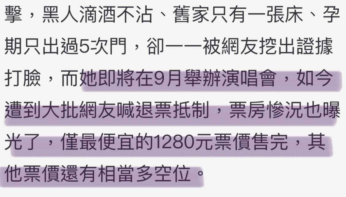 事实上,范玮琪演唱会的门票卖的并不好,除了最便宜的1280元一张的票售完外,其他票依然有很多空位,如今黑人被指控性骚扰后,范玮琪不但不认错,甚至还要起诉大牙,要求对方赔偿千万台币。