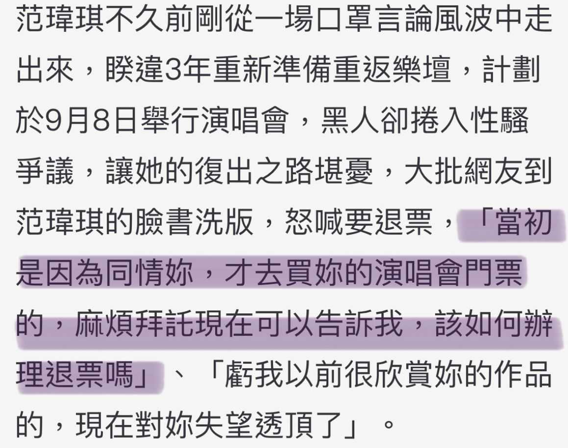 据悉,此次是范玮琪时隔三年重返舞台,之前还经历了口罩言论风波,好不容易等风波平息,才计划开演唱会。不少网友表示,当初是因为同情你才去买你演唱的门票,现在我对你失望透顶,请告诉我,该如何办理退票。