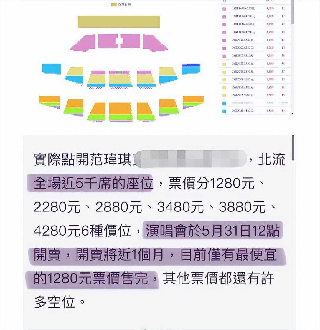 范玮琪演唱的票价分别是4280、3880、3480、2880、2280、1280等六个价位,从5月31日开始售票,卖了将近一个月,只有1280的票勉强售完,由此可见,支持她的人并不是很多。