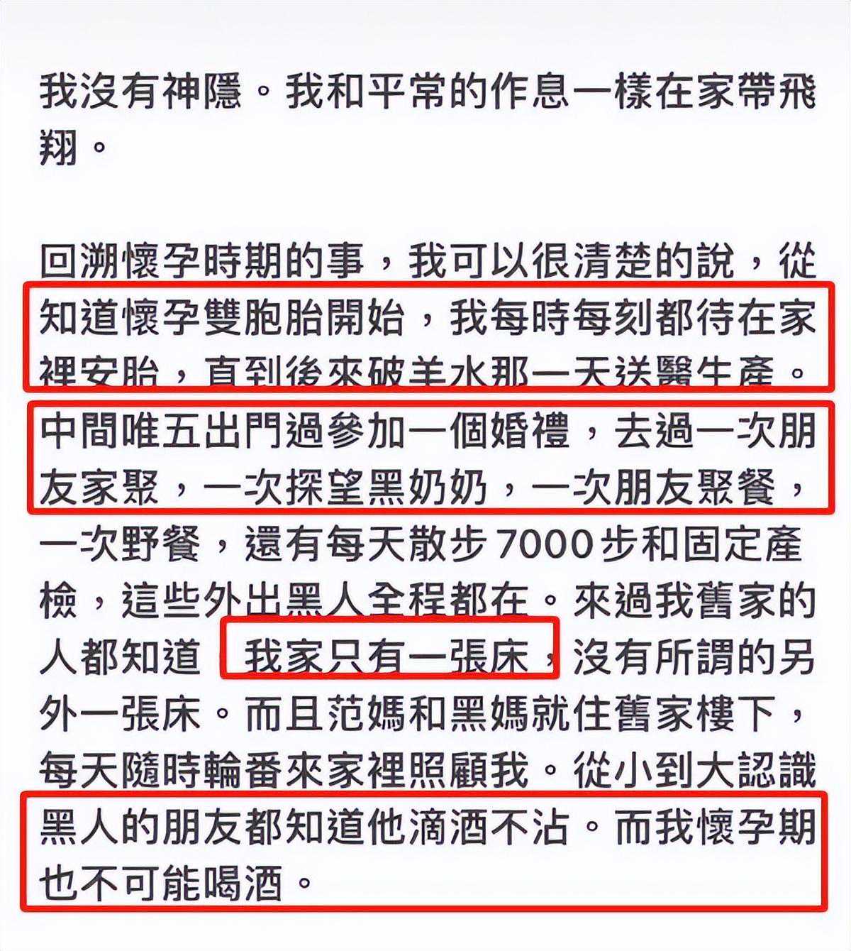 此前,范玮琪透露,她家只有一张床,怀孕期间,黑人一直都陪着她,不可能带其他女生回家,而且黑人平时滴酒不沾。