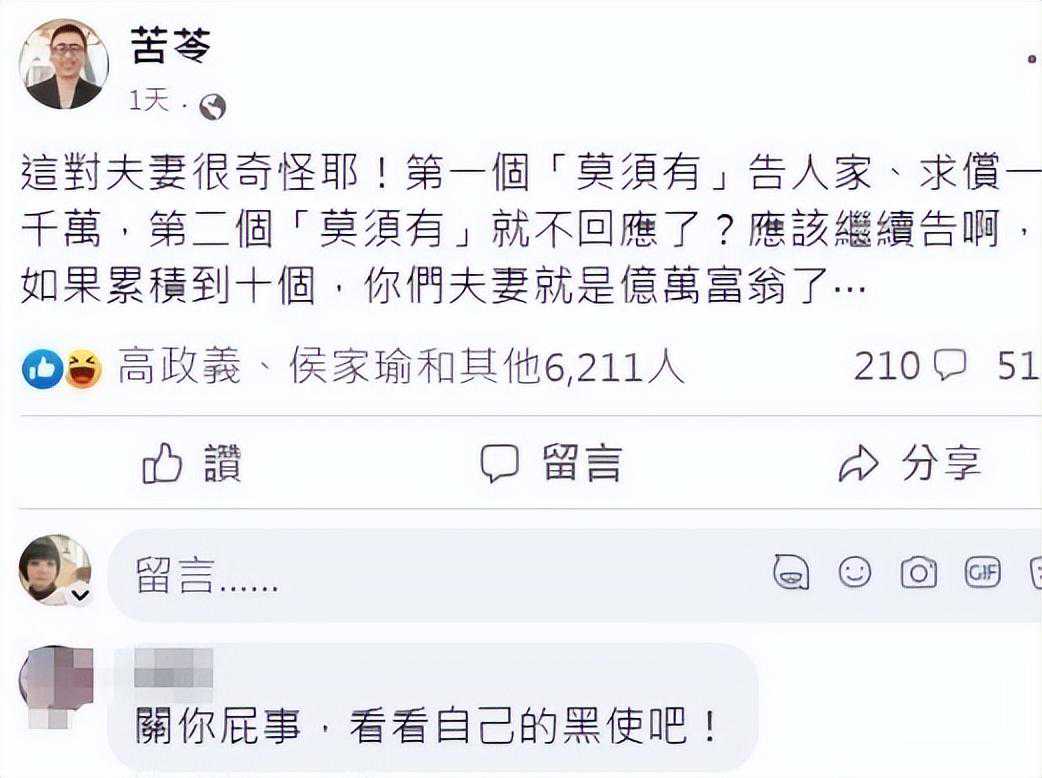 另外一边,大小S的姑姑苦苓出来力挺黑人夫妇,让他们继续起诉其他女星,如果累积十个,范玮琪黑人就是亿万富翁了,有网友留言,都自身难保了,还帮别人说话。