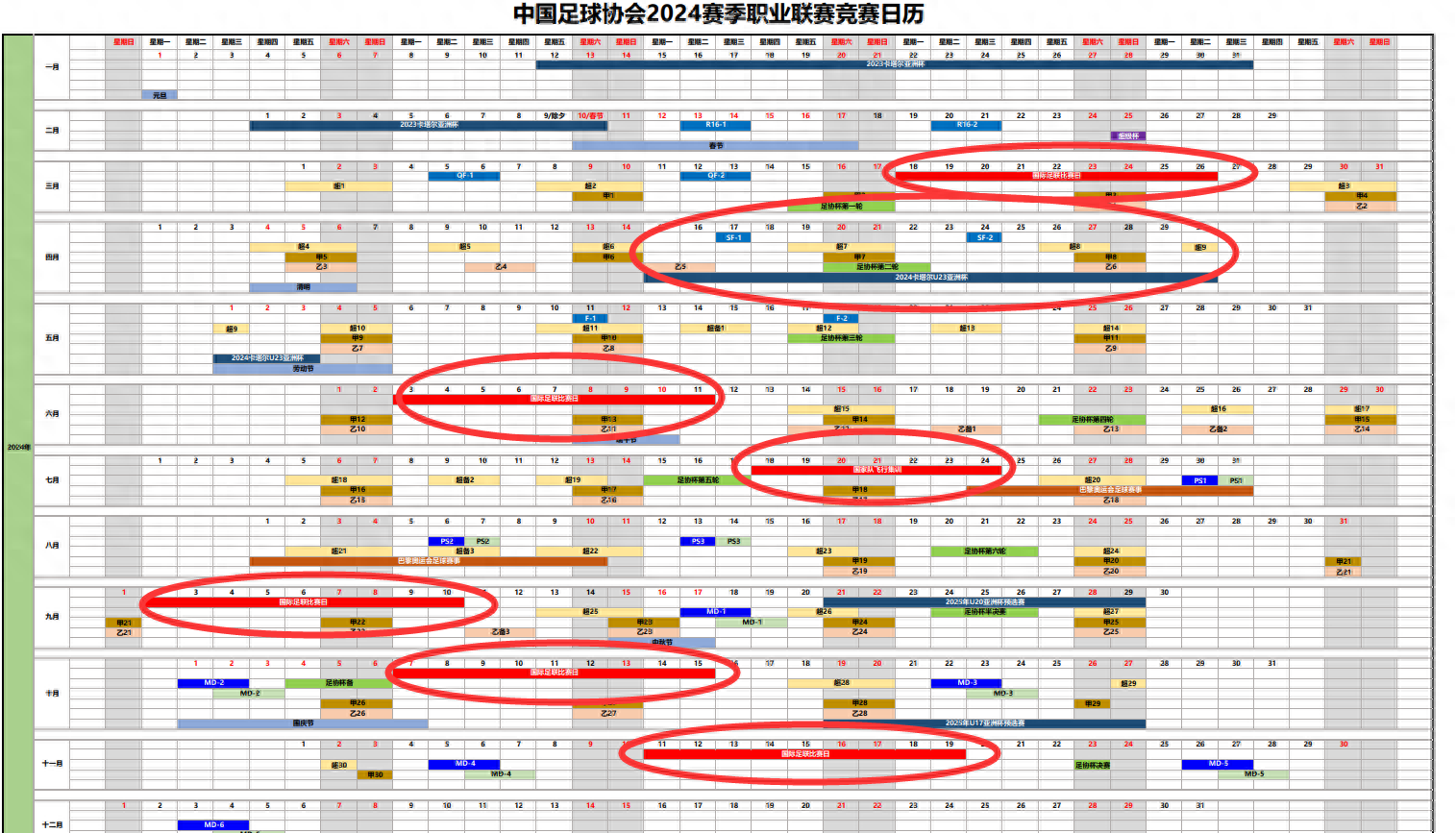 2024年中国足球的赛历中,除了年初的亚洲杯之外,全年一共有6次的国足集训计划,分别是3月份、6月份、9月份、10月份、11月份的国际比赛周,以及7月份的国足飞行集训。除了11月份的国际比赛周之外,中超一共要为国足让路5次。