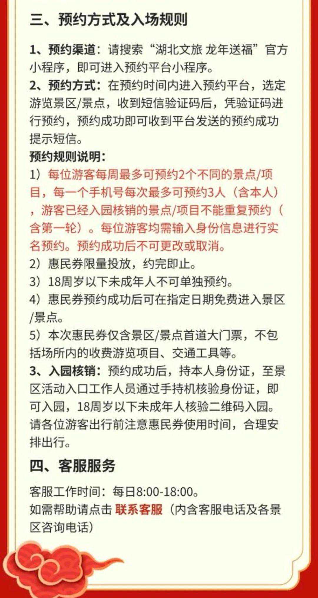 本次惠民活动将于今晚(3月11日)20:00开始,识别下方小程序二维码,或微信搜索“湖北文旅龙年送福”小程序即可预约,本地市民及全国游客都能参与。