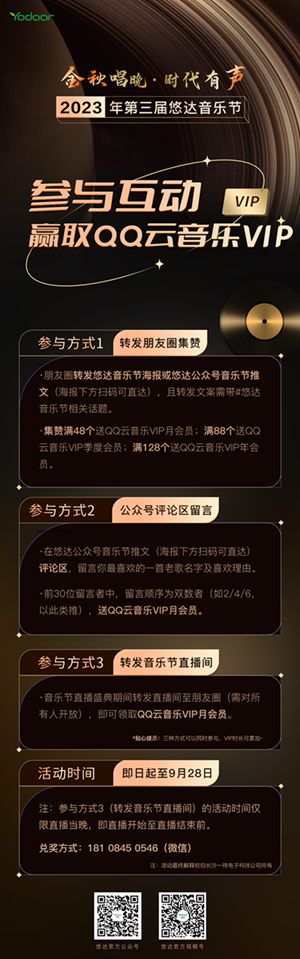 参与方式一:朋友圈转发悠达音乐节海报或本篇推文,并邀请好友集赞,即有机会获得QQ云音乐VIP月会员、季度会员、年会员等不同等级的奖励。