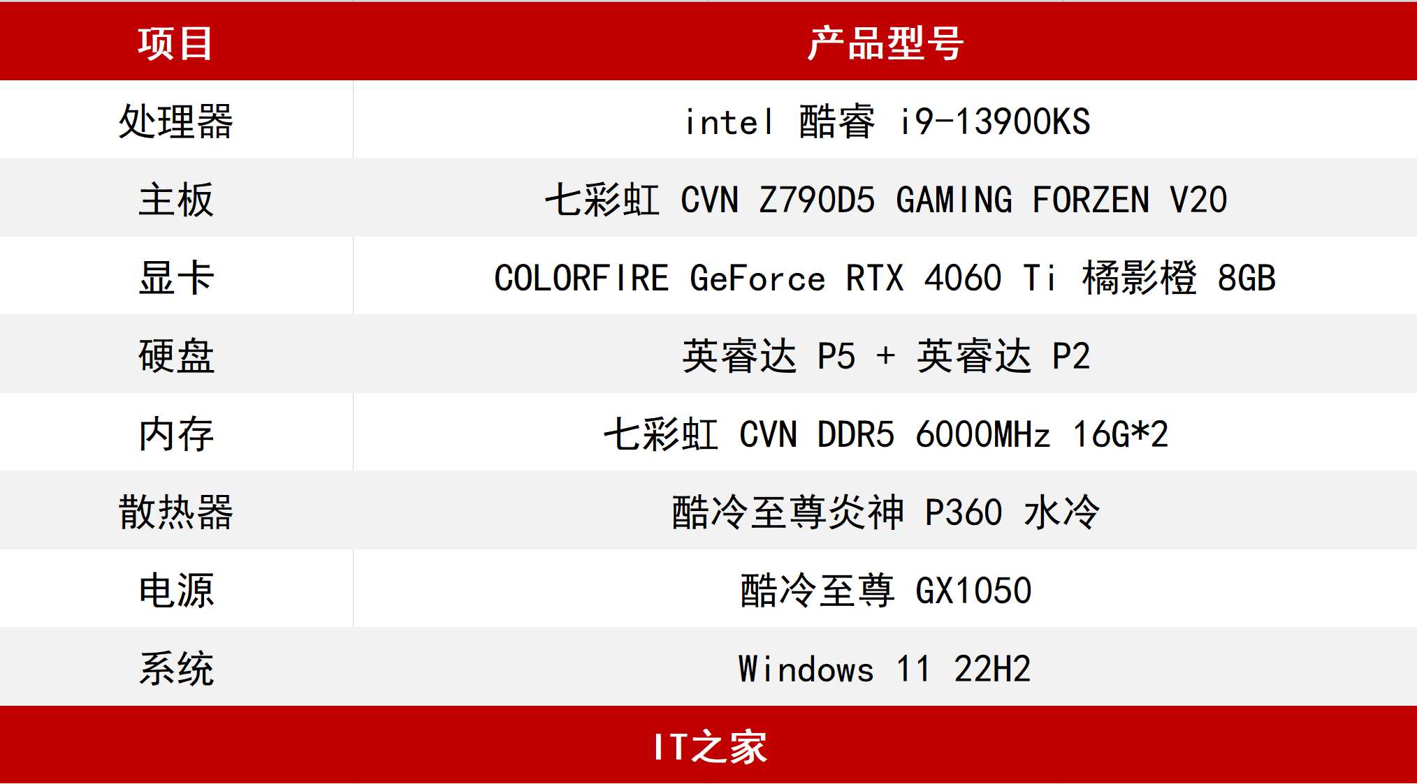 IT之家也是提前收到了COLORFIREGeForceRTX4060Ti橘影橙8GB,在本次测试中,我们将使用一套高配七彩虹全家桶来测试,具体配置如下: