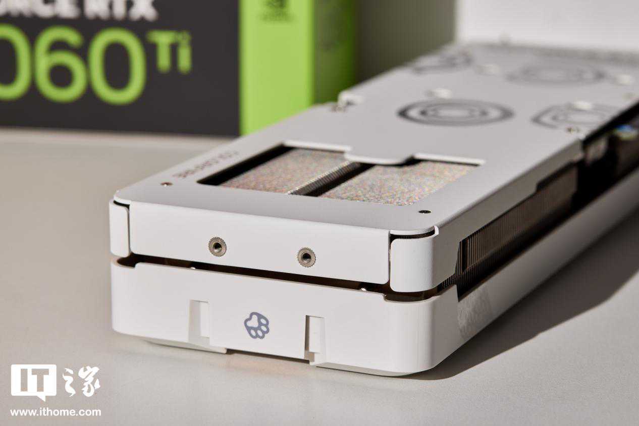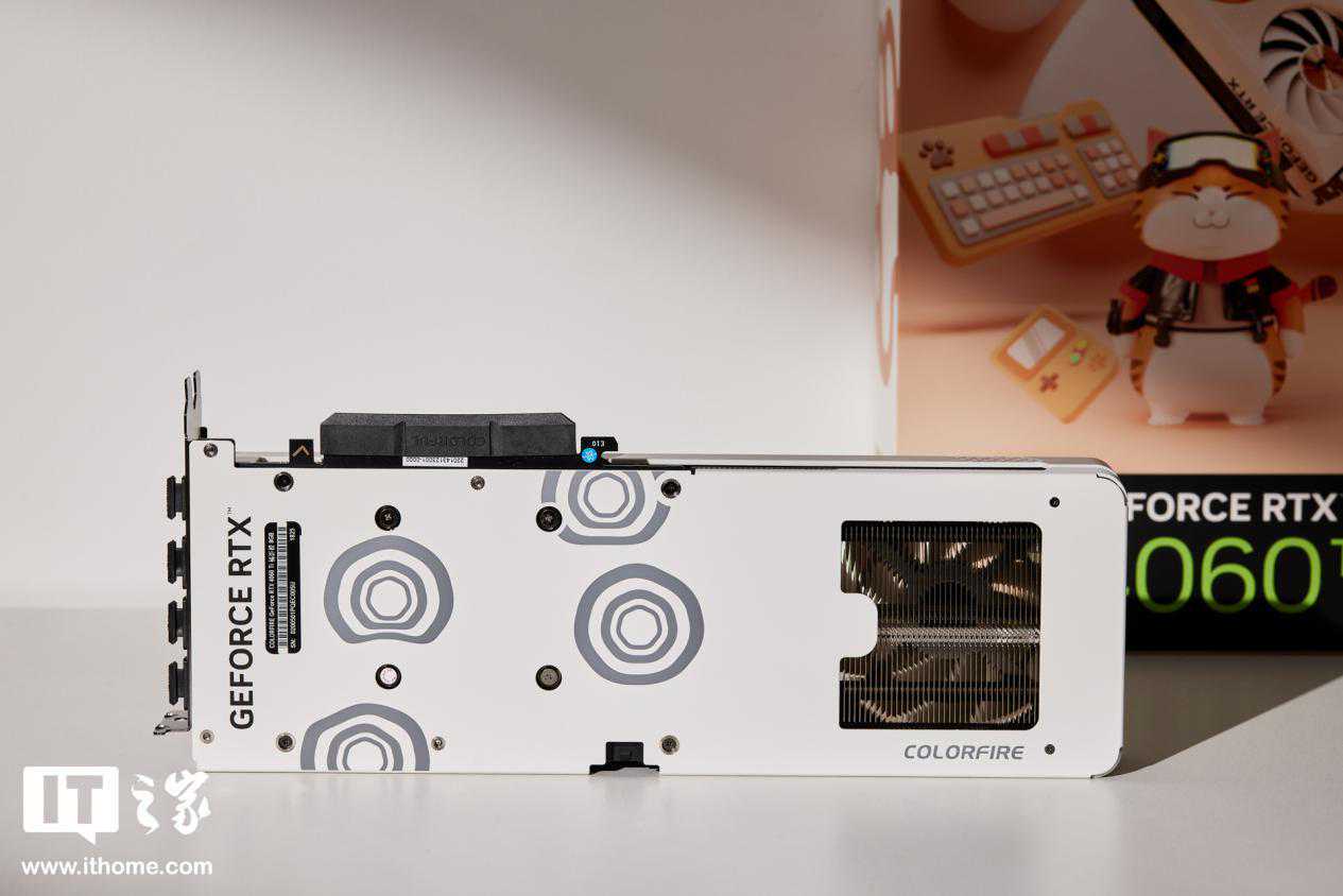 显卡整体的设计圆润Q弹,粉粉圆圆的让人很想捏上一把。粉白色风扇中间有一只肥猫的形象,这个形象就是显卡包装上的那只大橘,名叫“橘宝”。风扇下方有一个小小的MEOW字样,代表着这个系列的英文名:COLORFIRERTX4060TiMEOW。