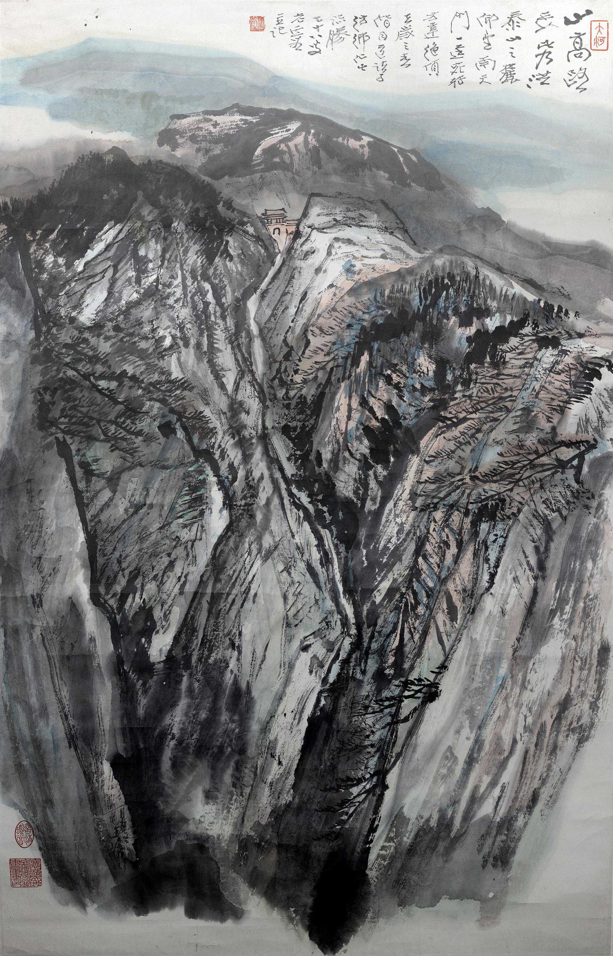 华山素来以险峻著称,顶天立地看上去好像一道天然屏障。何海霞画华山的时候喜欢用青绿色彩,让华山多了一丝“俏皮”。恰当地运用色彩,可以拉近作品与欣赏者间的距离。在传统审美中,山水画一定要有代入感。何海霞潜心研究之后,画出了华山鲜为人知的一面。