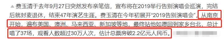 据悉,费玉清在今年年初便已开始自己的“告别演唱会”巡演,首站在南京举办,跨越多地甚至在海外还安排了好几场,最终回到家乡台北,总计37场演唱会。