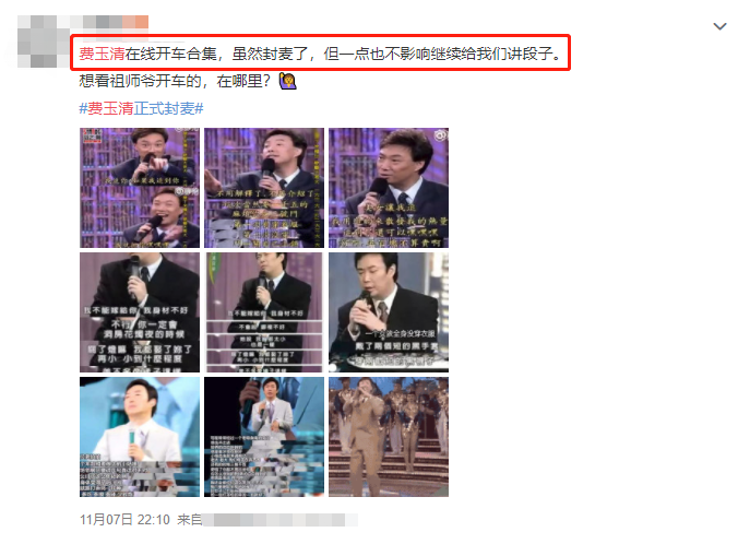 某社交平台大V就非常直白地配出了九张费玉清的“尺度发言”截图,并幽默的调侃道:“费玉清虽然封麦了,但一点也不影响他继续给我们讲段子。”