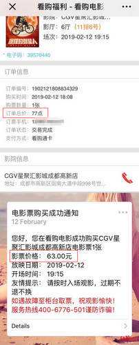 近日,拥有一张“看购电影”会员卡的成都市民彭小姐想去影院看一场热门国产电影。当天18时许,她通过“看购电影”微信公众号“看购福利”购买了一张19:15开场的电影票,观影地点是CGV星聚汇影城成都高新店。当微信收到“电影票购买成功通知”时,她看到,影票价格为63元。而订单信息显示,订单总价为77点。“63元77点?”她脑中闪过一串问号。