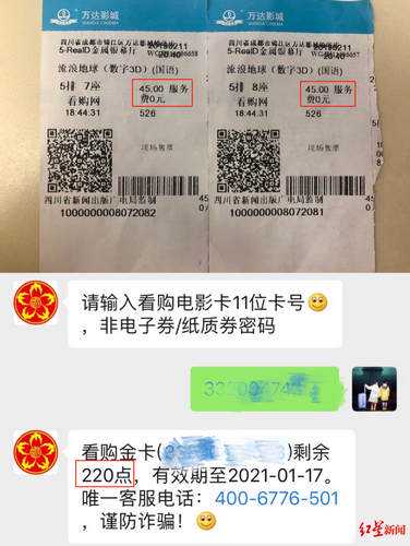 红星新闻翻看卡片使用说明,并未就“服务费收取”进行告知,便再次致电“看购电影”客服。对方称,没有服务费。“每一台机器都有一个代码,每个影院可能代码都不一样。像我给你解释了很多遍都不能理解,所以影院工作人员就可能嫌麻烦说是服务费。这个不是过年加的服务费,没有过年也这样。”客服人员表示,如果线上买票,就显示票价实际多少点;如果现场购买,电影票上面的金额就会跟实际扣的点数不一致。