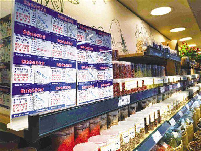 在熟食、面点、调味品区域,所有加工制作好的商品都整齐地摆放在货柜内,并用透明干净的玻璃罩起来。每种食品上方都有“散装食品标示签”,并标注着食品名称、生产日期、保质期、价格等信息。“购买时请留意生产日期及储存条件”的提示随处可见。“《办法》没有实施前,超市在散装食品售卖上已有一套严格的标准。”北京华联兰州王府井店食品安全主管闫静萍介绍,箱体装的散装食品,工作人员会查看“电子一票通”、质检报告等相关信息,确认无误后放在展示柜中,并将价签、合格证等进行公示。