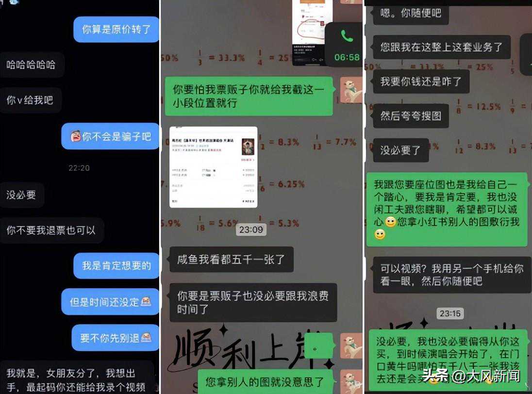 开演唱会前夕,骗子谎称已买到票但家中有事去不了,或者跟前任分手“含泪转让”,在一些二手交易网站搭讪向受害者售票,拿到钱就拉黑。