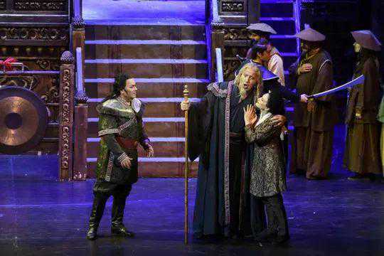 乐池里的交响乐团乐手准备就绪,深红色的厚厚幕布缓缓拉开,三层阶梯组成的蓝紫色宫殿引入眼帘,舞台两侧的十根金黄色立柱被巨龙浮雕缠绕,随着群演们低沉的歌声,中国最熟悉的“图兰朵公主”、国际著名戏剧女高音乔凡娜·卡索拉缓缓登台倾情献唱,她的演出被称为“教科书般的经典”。