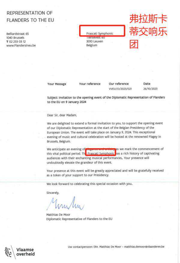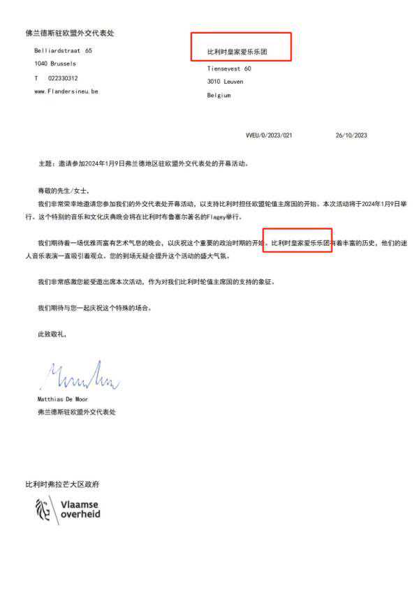 他提供了一份弗兰德斯驻欧盟外交代表处给该乐团参加活动的邀请函和邀请函的中文版,并表示,“文中明确指出乐团是一个有悠久历史的交响乐团,并且于明年1月9日代表比利时参加欧盟轮值主席国的活动。”