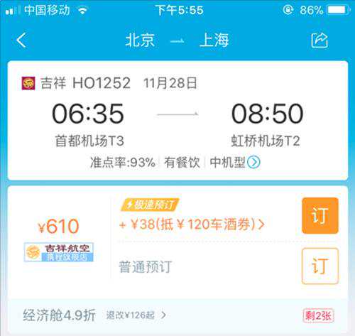 下午5点55分,记者先用A手机打开携程旅行APP,在上面随意选取了11月28日北京至上海的吉祥航空HO1252号航班的经济舱。吉祥航空携程旗舰店显示票价为610元,剩余票2张,显得票很紧俏。