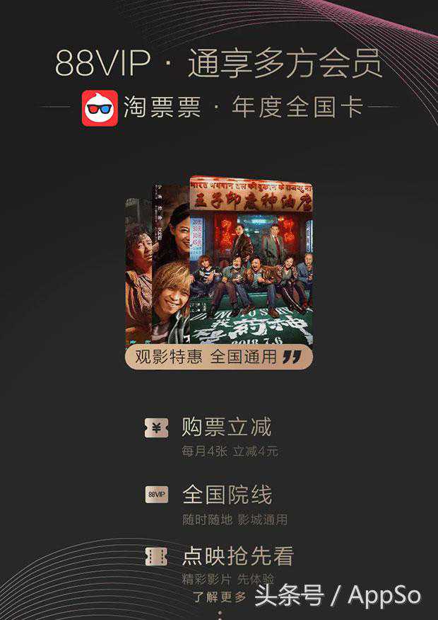 没想到,半年以后,城市卡换了个马甲出现了。在阿里8月推出的「88VIP」会员中,就有一项「淘票票年度全国卡」的,每月可获得4次立减4元的优惠,可与其他优惠、折扣卡叠加。