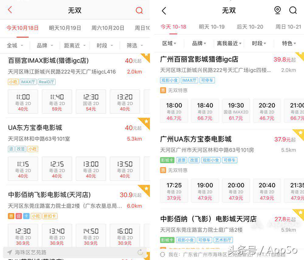 我们挑了上海和广州两家影院作为样本,同一天、同一场次的票价对比如下(猫眼的折扣价为首单优惠,低于正常的折扣价):